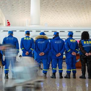 2月8日,藍天救援隊隊員在機場(chǎng)大廳內搬運行李物資。