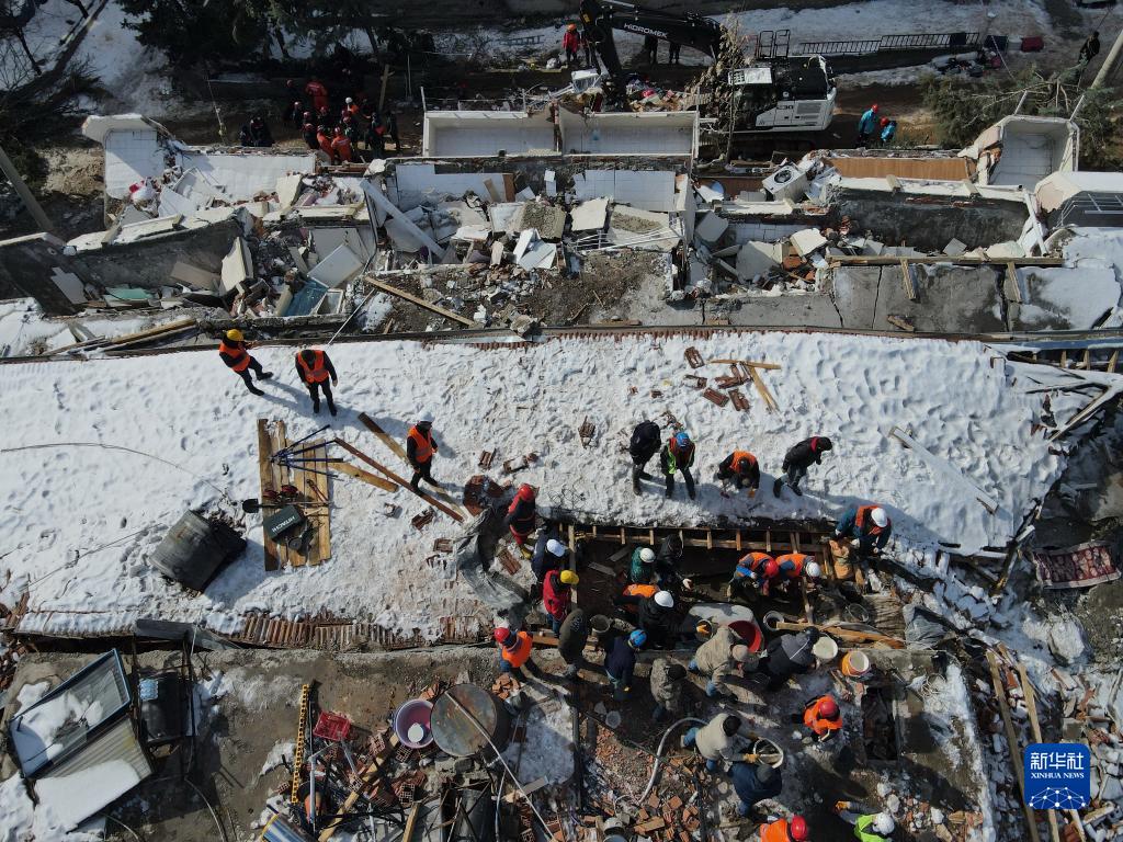 2月8日,在土耳其阿德亞曼省貝斯尼,救援人員在地震廢墟搜救(無(wú)人機照片)。