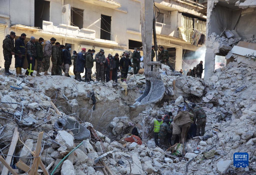 2月8日,救援人員在敘利亞阿勒頗的一處地震廢墟搜救。