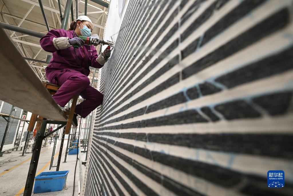 一位女工在圣源地毯集團有限公司生產(chǎn)車(chē)間使用槍刺工藝制作地毯(2月1日攝)。