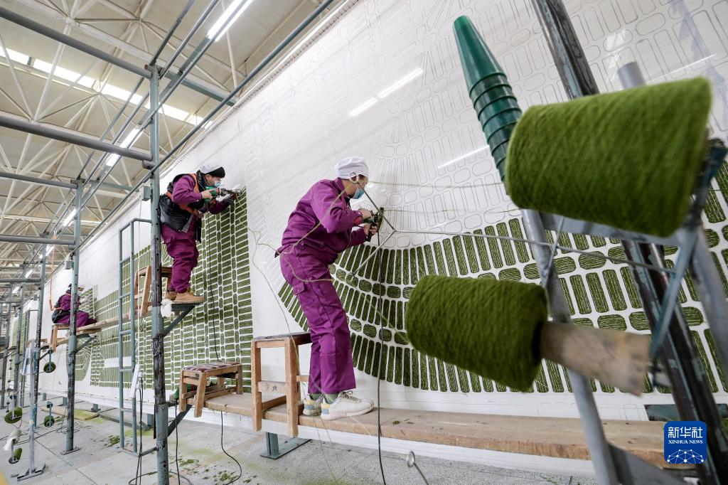 女工們在圣源地毯集團有限公司生產(chǎn)車(chē)間內使用槍刺工藝制作地毯(2月4日攝)。