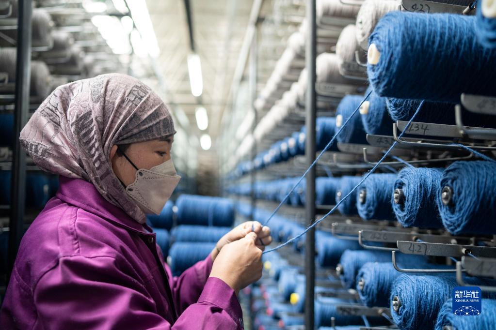 在青海省西寧市圣源地毯集團有限公司生產(chǎn)車(chē)間,操作工在接線(xiàn)頭(2月1日攝)。