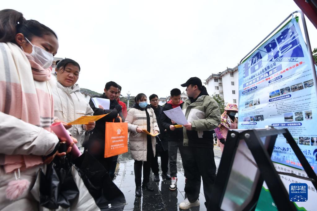 2月9日,在廣西融水苗族自治縣易地扶貧安置點(diǎn)苗美家園社區,求職者在了解崗位信息。