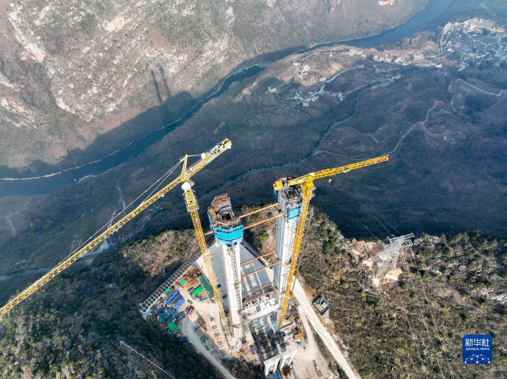 這是2月1日拍攝的花江峽谷大橋施工現場(chǎng)(無(wú)人機照片)。
