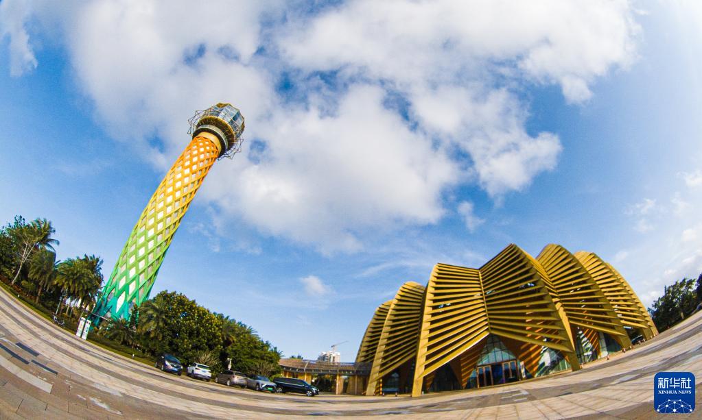 2月8日拍攝的海南自貿港重點(diǎn)園區——??诮瓥|新區標志性建筑江東塔和江東新區展示中心(全景相機拍攝)。
