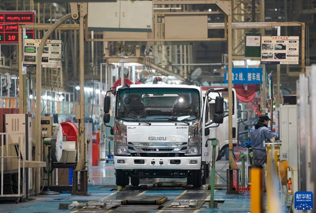 這是2月7日拍攝的慶鈴汽車(chē)(集團)有限公司繁忙的商用車(chē)整車(chē)生產(chǎn)線(xiàn)。