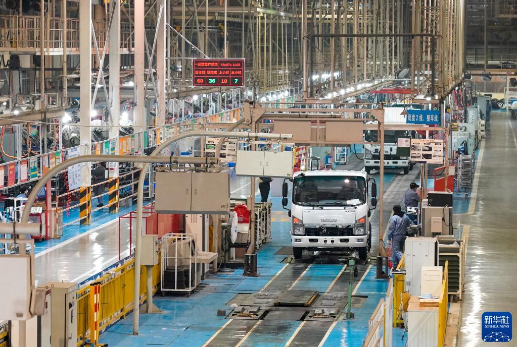 這是2月7日拍攝的慶鈴汽車(chē)(集團)有限公司繁忙的商用車(chē)整車(chē)生產(chǎn)線(xiàn)。