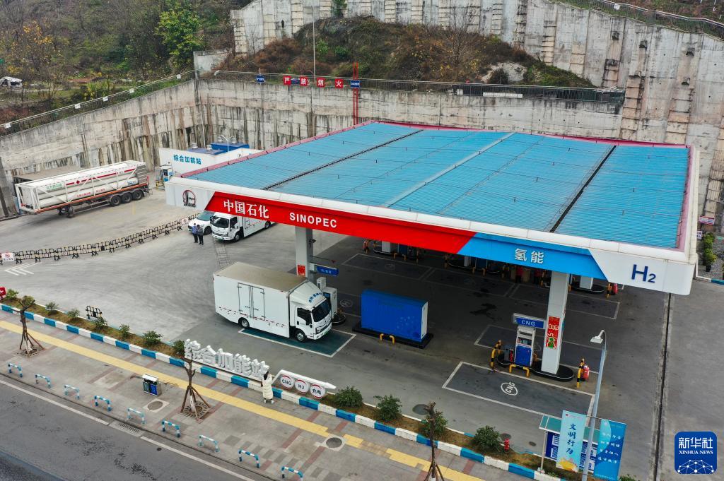 2月8日,在位于九龍坡區的重慶首座加氫站內,一輛慶鈴汽車(chē)(集團)有限公司生產(chǎn)的氫動(dòng)力商用車(chē)正在加氫(無(wú)人機照片)。