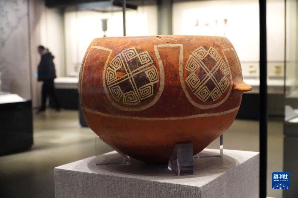 2月9日,在孔子博物館舉行的山東文物精品展上拍攝的山東省文物考古研究院收藏的大汶口文化云雷紋彩陶釜。