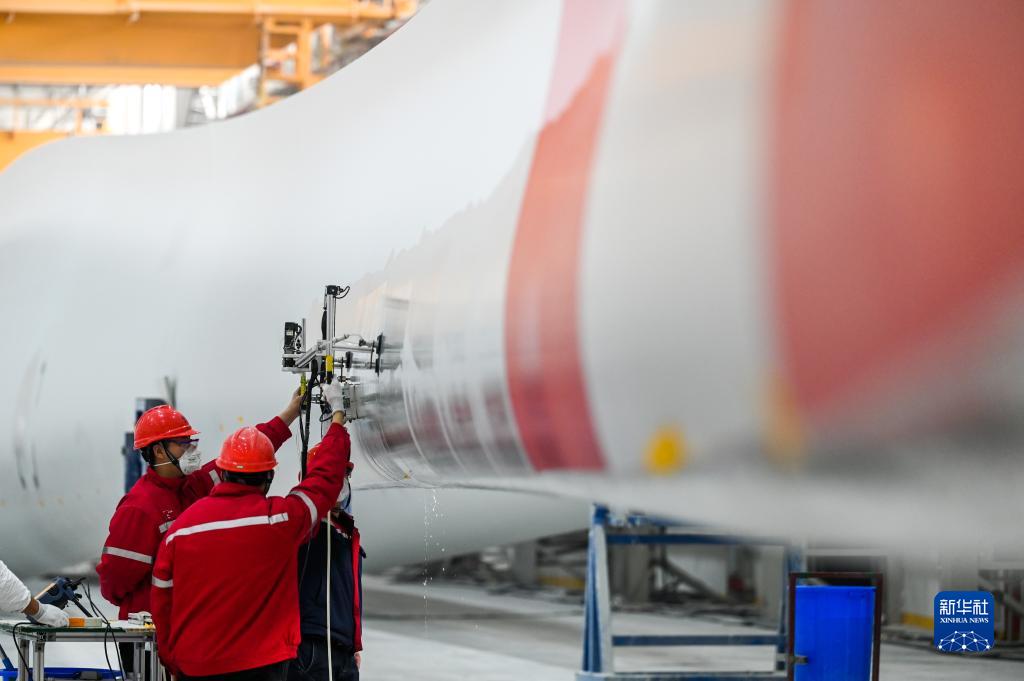 2月9日,在內蒙古烏蘭察布市遠景北方能源有限公司,質(zhì)檢員在風(fēng)機葉片生產(chǎn)線(xiàn)上工作。