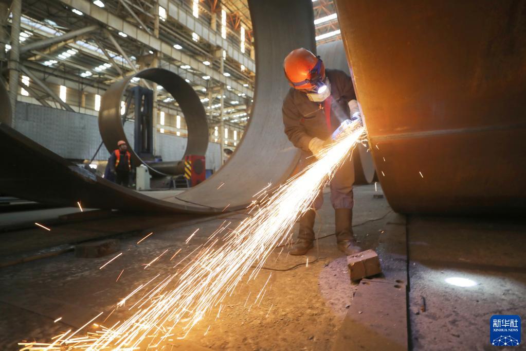 在位于江蘇省啟東市的一生產(chǎn)車(chē)間內,工人在進(jìn)行塔節打磨作業(yè)(2月7日攝)。
