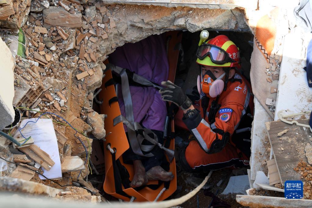 2月9日,中國救援隊隊員在土耳其哈塔伊省安塔基亞市深入受損建筑救援被困人員。