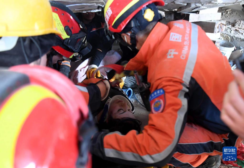 在土耳其南部地震重災區哈塔伊省安塔基亞市,中國救援隊同土耳其救援隊合作,于當地時(shí)間9日下午救出一名被埋在樓房廢墟下的女性幸存者。新華社記者 沙達提 攝