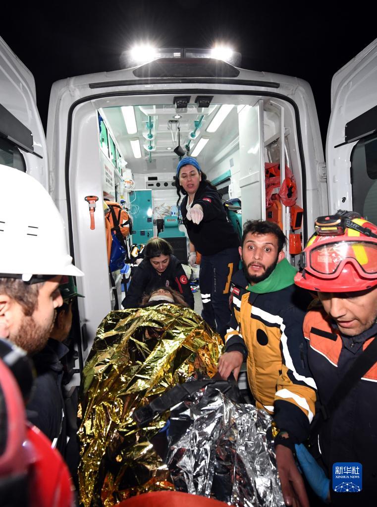 2月9日晚,在土耳其哈塔伊省安塔基亞市,中國救援隊與土耳其救援隊合力營(yíng)救出的幸存者被送上救護車(chē)。