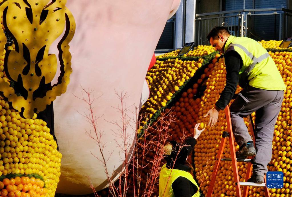 2月9日,在法國南部小城芒通,工作人員為檸檬節做最后準備。