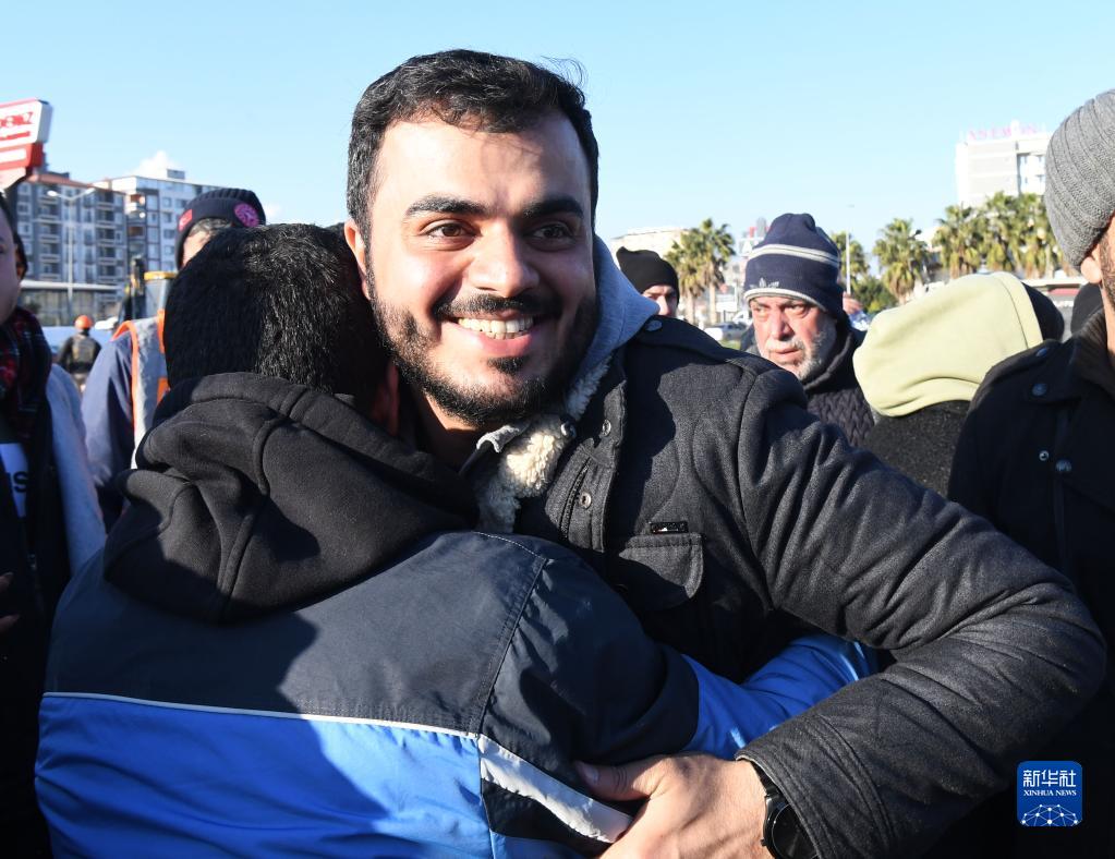 2月9日,在土耳其哈塔伊省安塔基亞市,救出的女性幸存者的親人擁抱致意。