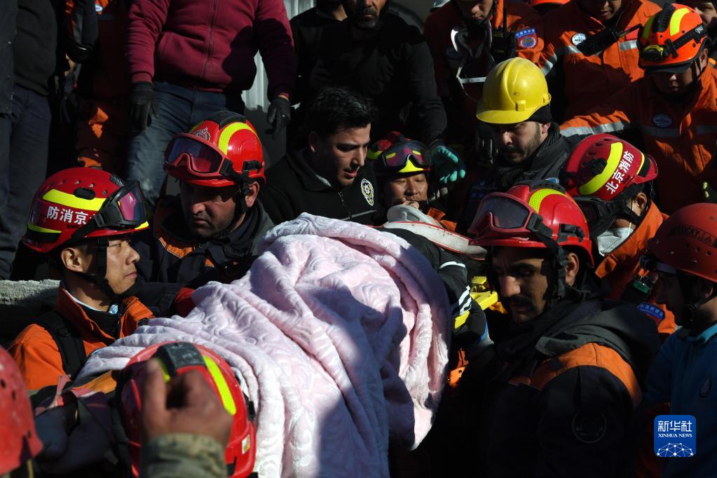 2月9日,在土耳其哈塔伊省安塔基亞市,中國救援隊與土耳其救援隊轉移一名救出的女性幸存者。