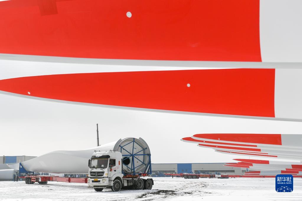 2月9日,車(chē)輛在株洲時(shí)代新材料科技股份有限公司蒙西分公司內運輸風(fēng)力發(fā)電葉片。