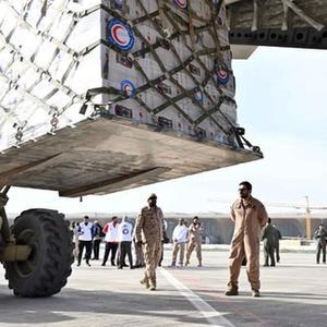 2月9日,工作人員在科威特費爾瓦尼耶省的科威特國際機場(chǎng)裝載人道主義援助物資。