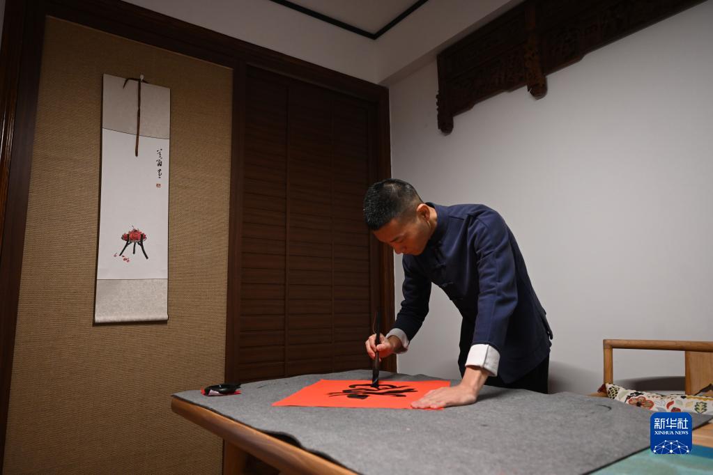 馬保利在家中寫(xiě)毛筆字(2月3日攝)。