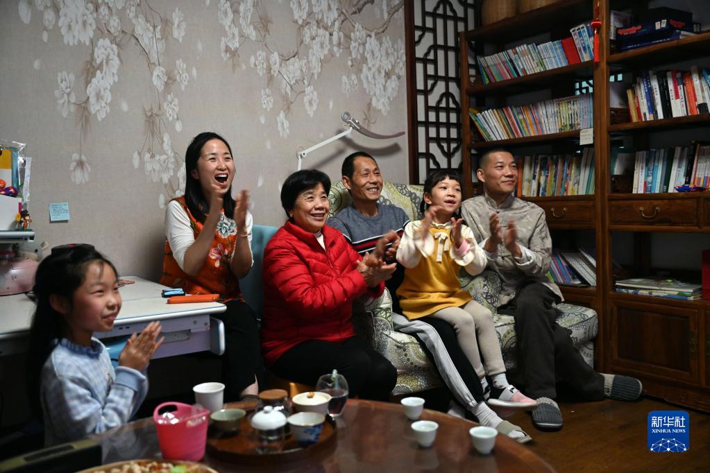 電視畫(huà)面播出馬保利獲得《2023中國詩(shī)詞大會(huì )》冠軍之后,家人為之歡呼(2月3日攝)。