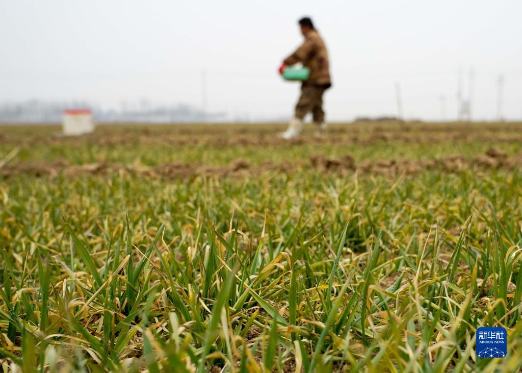 2月8日,安陽(yáng)市湯陰縣古賢鎮北韓莊村的村民在麥田施肥。
