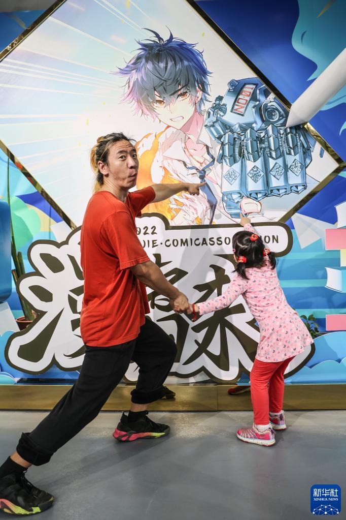 2月9日,在??谑旋垬蜴偛龑W(xué)村的“燚界·漫創(chuàng )社”創(chuàng )業(yè)孵化基地展廳內,漫畫(huà)家“極樂(lè )鳥(niǎo)”(左)和孩子在自己的動(dòng)漫作品前合影。