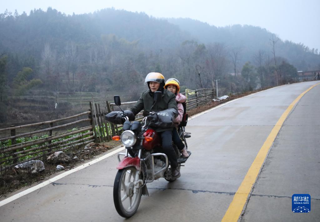 在楠木鄉官溪小學(xué)外的山路上,賴(lài)小田騎摩托車(chē)送家離學(xué)校較遠的學(xué)生陳玉婷回家(2月7日攝)。
