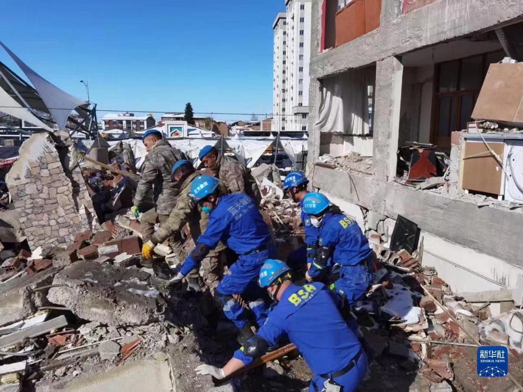 2月10日,在土耳其馬拉蒂亞省,中國藍天救援隊隊員探測到生命跡象后與當地救援人員協(xié)作開(kāi)展救援。
