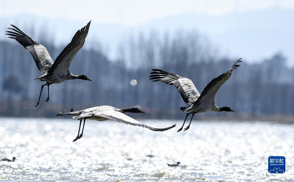 2月10日,黑頸鶴在貴州草海國家級自然保護區飛翔。