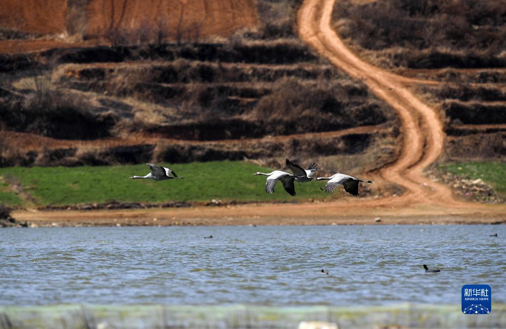 2月10日,灰鶴在貴州草海國家級自然保護區飛翔。