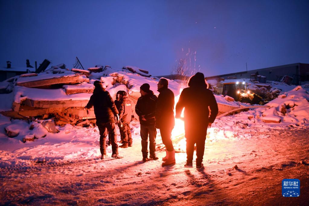 2月7日晚,在土耳其卡赫拉曼馬拉什省南部的埃爾比斯坦地區,救援人員在廢墟旁燒火取暖。