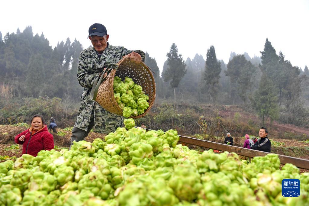 2月10日,南充市嘉陵區安福鎮埡子口村的村民在收獲青菜頭。