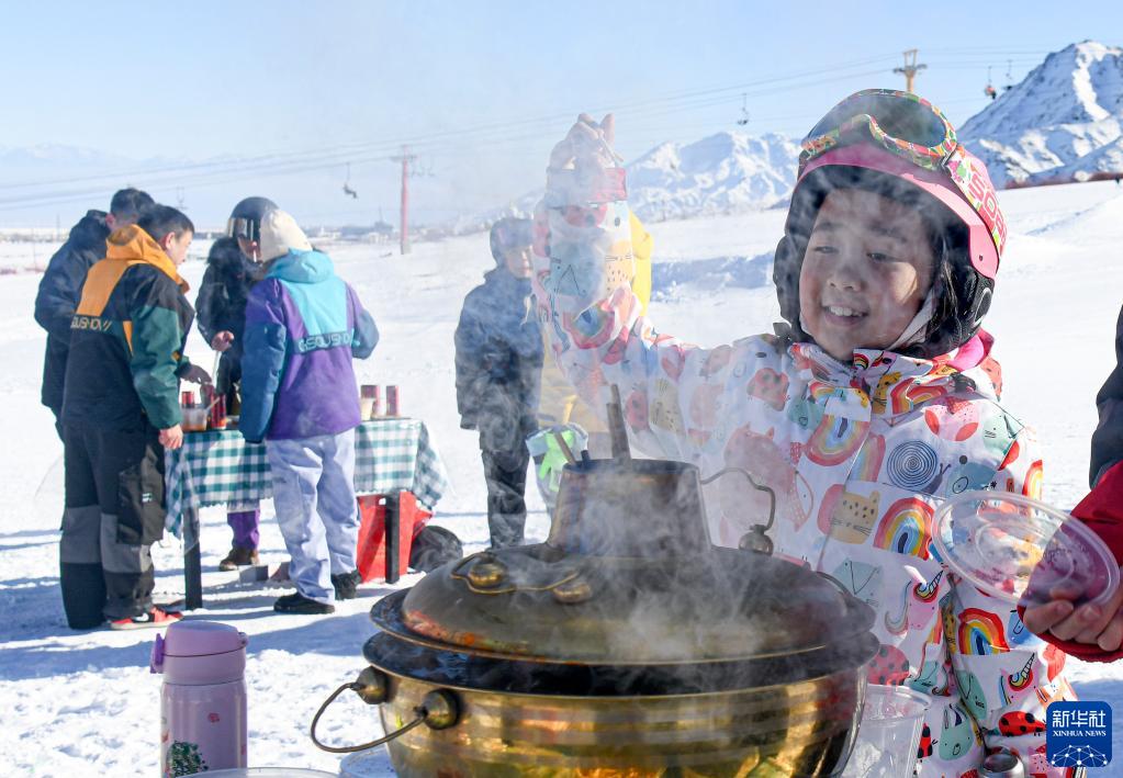新疆白云國際滑雪場(chǎng),小朋友在雪場(chǎng)舉辦的冰雪火鍋節上等待品嘗美食(2023年1月13日攝)。新華社記者 王菲 攝