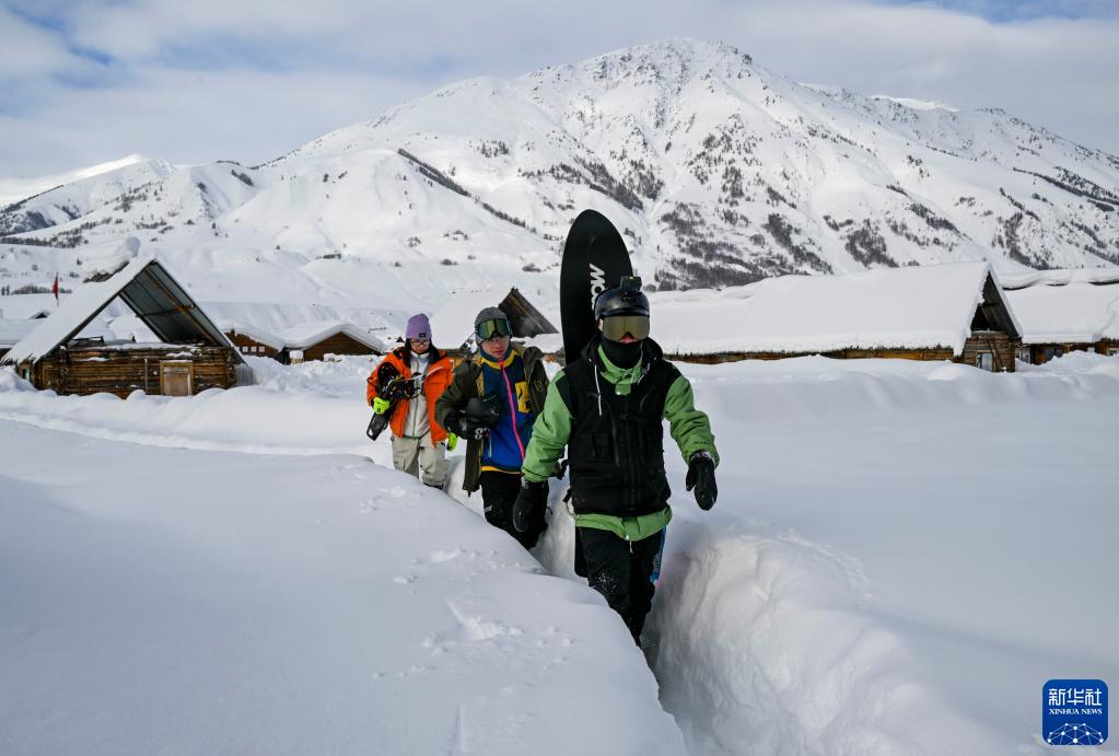 來(lái)自廣東的雪友在新疆阿勒泰地區禾木村游玩(2023年1月14日攝)。新華社記者 胡虎虎 攝