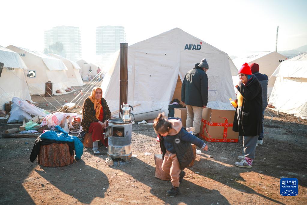 2月11日,在土耳其哈塔伊省安塔基亞市,受地震影響的人們在帳篷外休息。