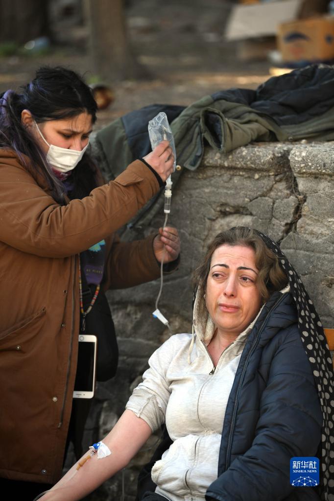 2月11日,一名女子在土耳其哈塔伊省安塔基亞市一處地震廢墟附近輸液。