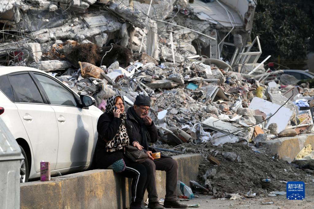 2月11日,人們坐在土耳其哈塔伊省安塔基亞市一處地震廢墟旁。