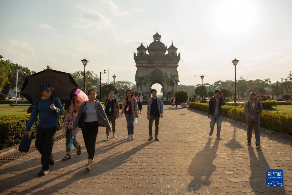 2月7日,游客在老撾首都萬(wàn)象凱旋門(mén)附近游覽。