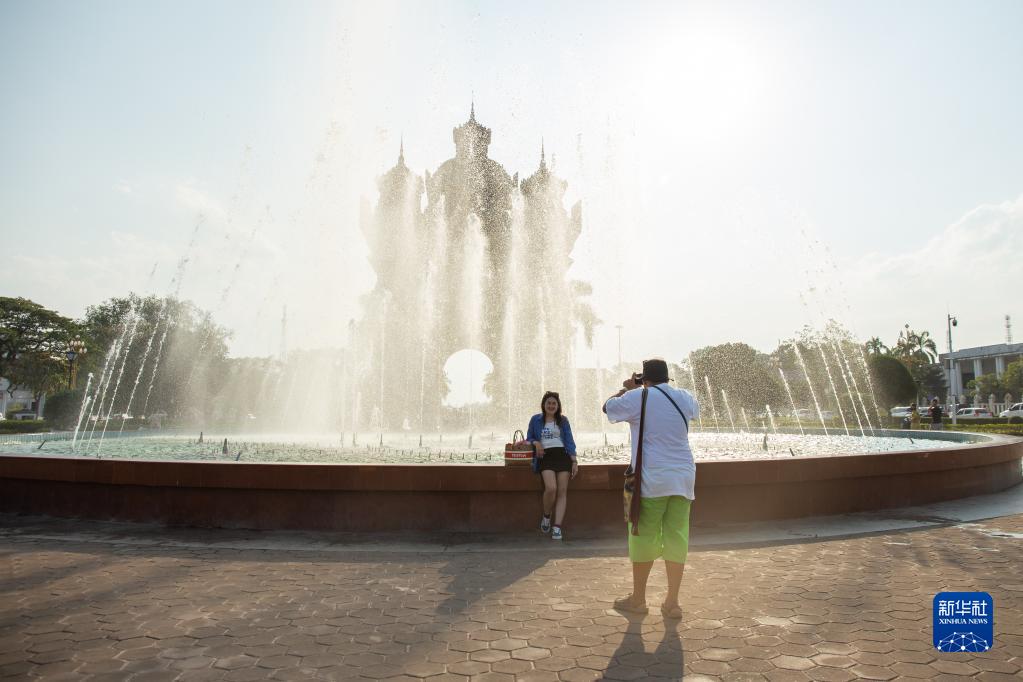 2月7日,游客在老撾首都萬(wàn)象凱旋門(mén)附近留影。