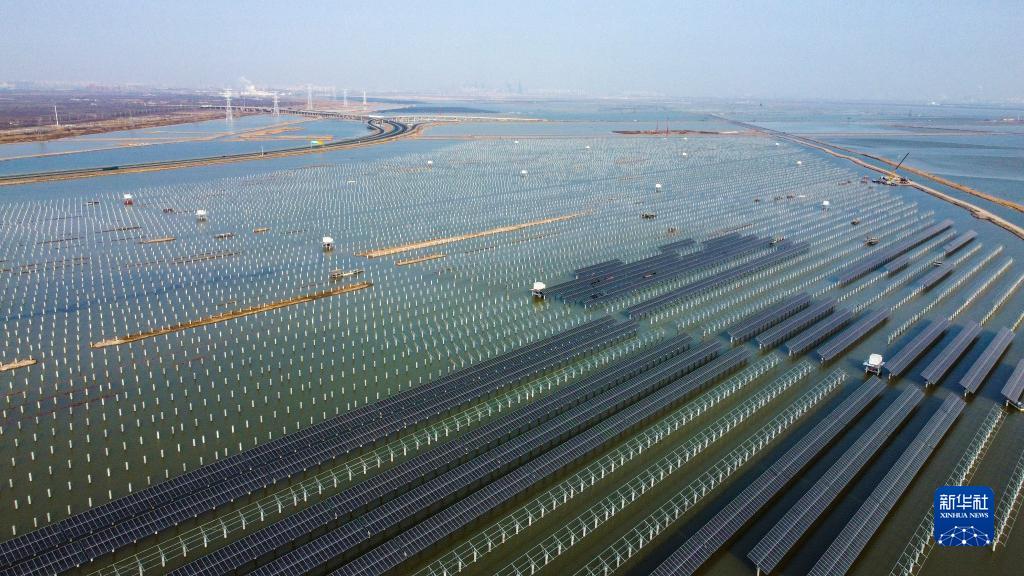 2月7日拍攝的建設中的天津濱海新區龍源海晶鹽光互補項目(無(wú)人機照片)。
