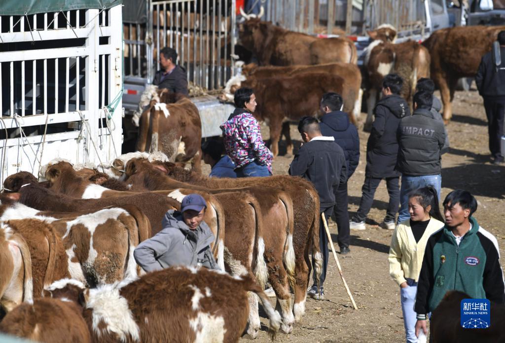 2月11日,人們在貴州省威寧縣小海鎮牲畜交易市場(chǎng)選購牲畜。