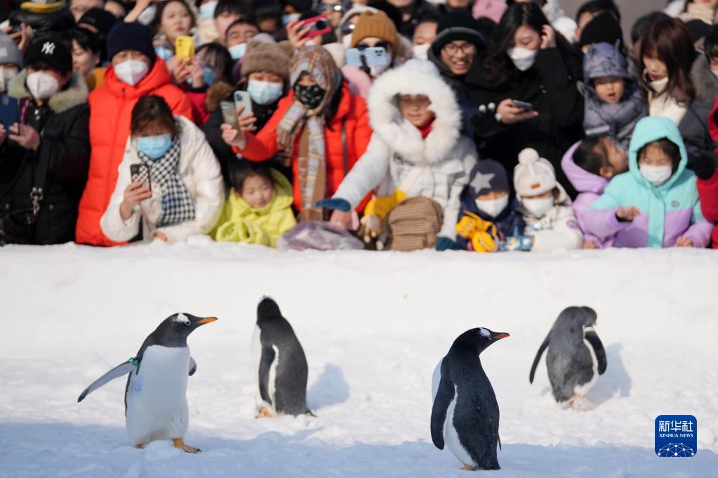 2月12日,哈爾濱極地公園在戶(hù)外“巡游”的企鵝吸引了眾多游客的目光。