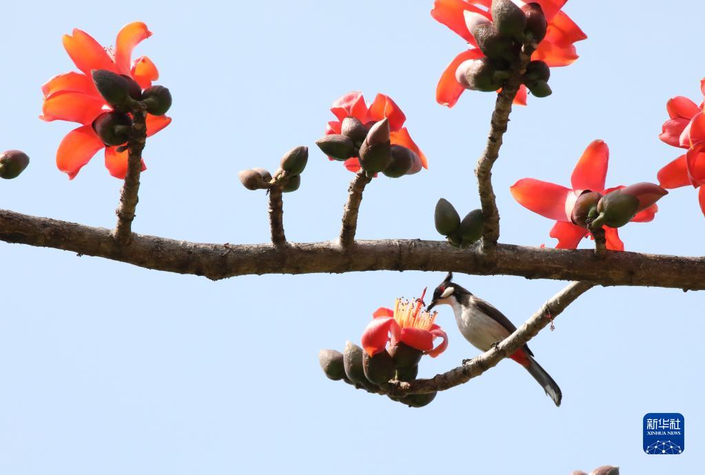 2月12日,鳥(niǎo)兒在云南省景洪市瀾滄江畔的木棉樹(shù)枝頭吸食花蜜。