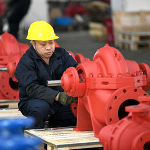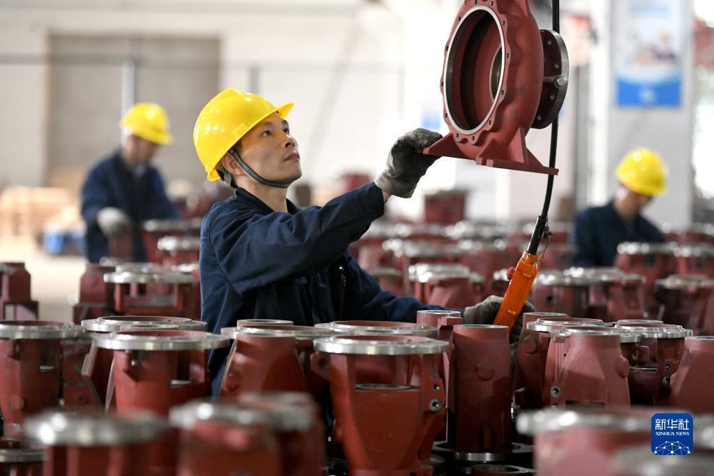 2月13日,工人在福建福州閩侯縣的毅飛泵業(yè)(福州) 有限公司生產(chǎn)線(xiàn)上吊裝水泵部件。