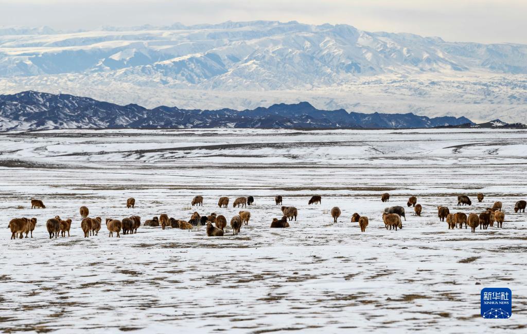 羊群在新疆裕民縣巴爾魯克山南坡的冬牧場(chǎng)上覓食(2月9日攝)。