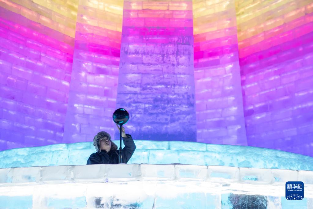 2月12日,冰雪元宇宙體驗中心的工作人員在冰雪大世界內拍攝體驗素材。