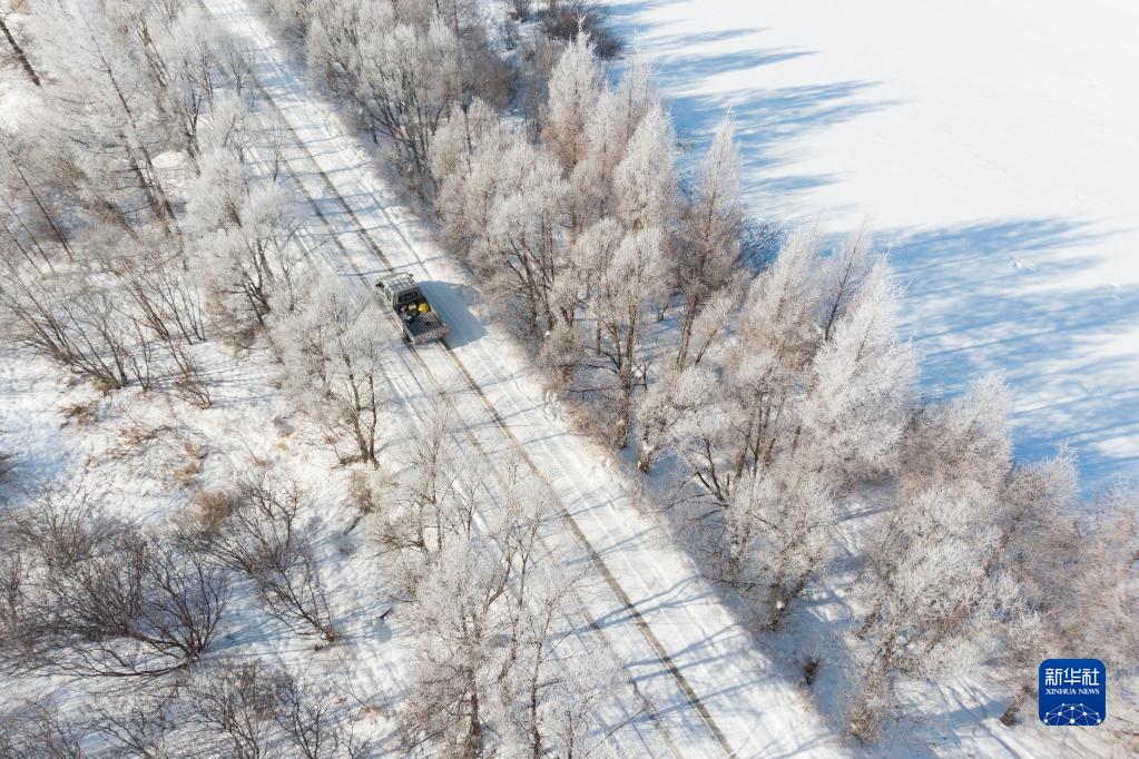 黑龍江省黑河市五大連池市龍鎮附近的霧凇景觀(guān)(2月13日攝,無(wú)人機照片)。