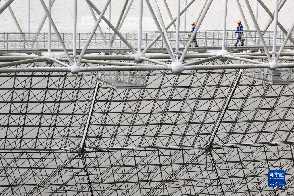 2月13日,工作人員從“中國天眼”的圈梁上經(jīng)過(guò)(維護保養期間拍攝)。