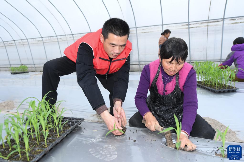2月14日,在航頭鎮航川村,黨員志愿者在大棚內幫助農戶(hù)種植玉米秧。